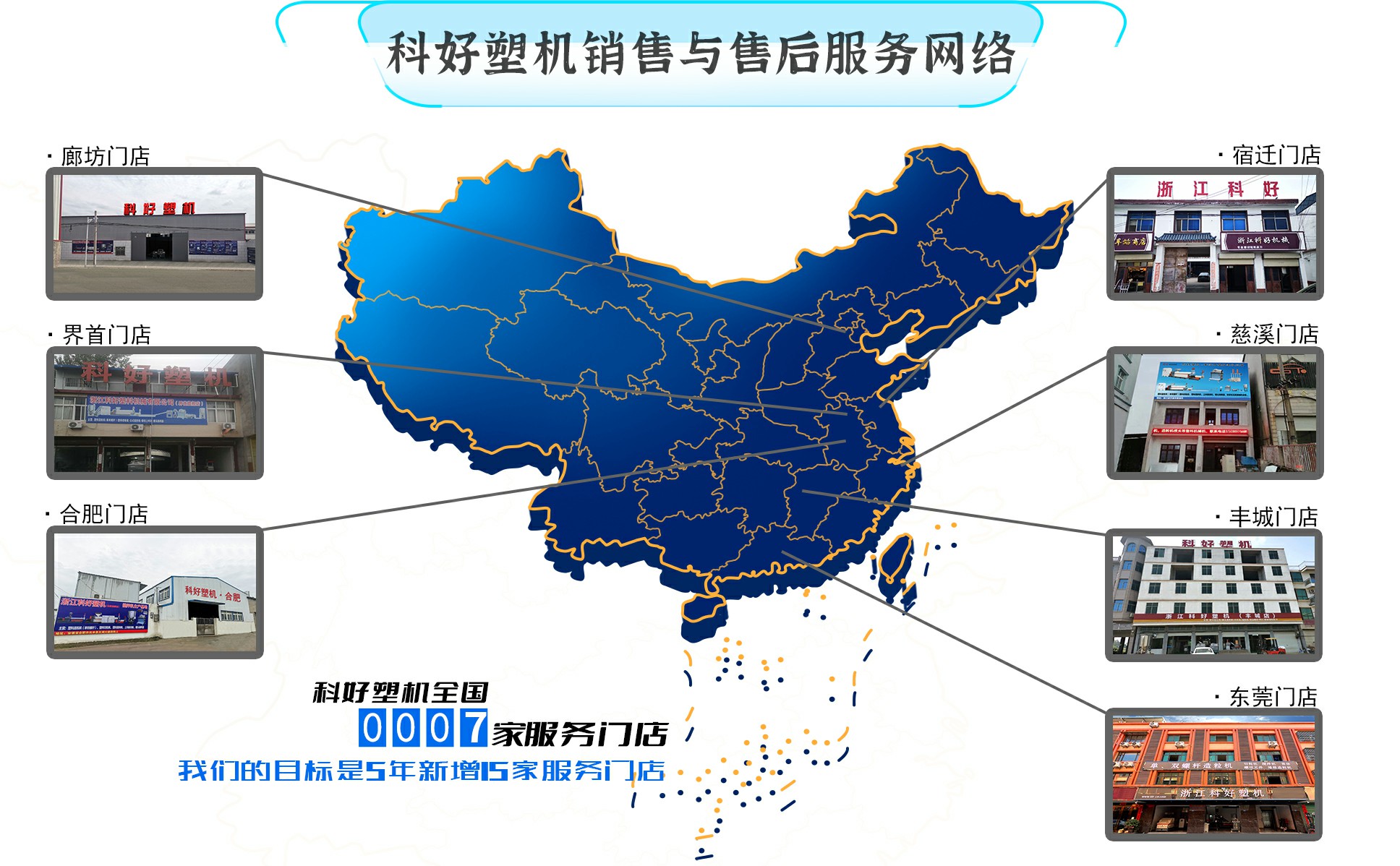 科好塑機先后創(chuàng)立了浙江慈溪門店,江蘇宿遷門店,江西豐城門店,安徽界首門店,廣東東莞門店、安徽合肥門店,河北廊坊門店全國7家服務(wù)門店。